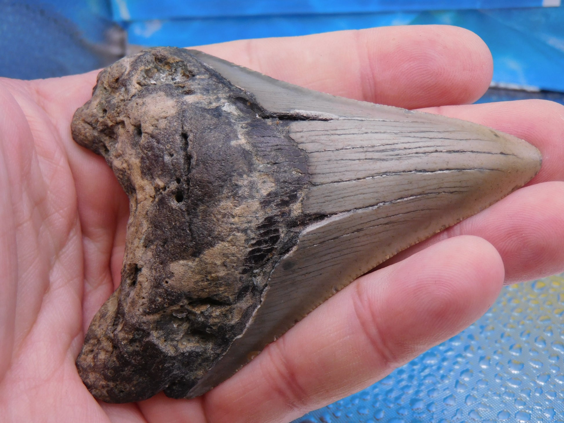 The name Megalodon means "big tooth", and it certainly is! This prehistoric shark roamed the oceans about 2.5 - 23 million years ago reaching lengths of up to 60 feet. Some scientists believe there may have been larger specimens reaching up to 80 feet long! They say each inch of tooth is equivalent to 10 feet of shark.