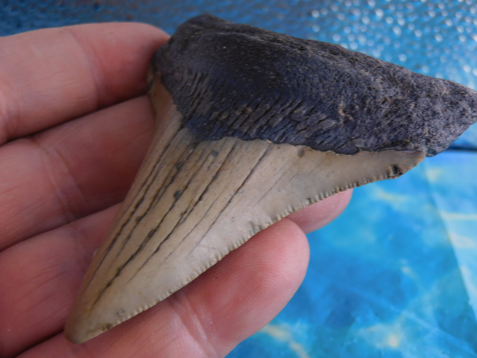 The name Megalodon means "big tooth", and it certainly is! This prehistoric shark roamed the oceans about 2.5 - 23 million years ago reaching lengths of up to 60 feet. Some scientists believe there may have been larger specimens reaching up to 80 feet long! They say each inch of tooth is equivalent to 10 feet of shark.