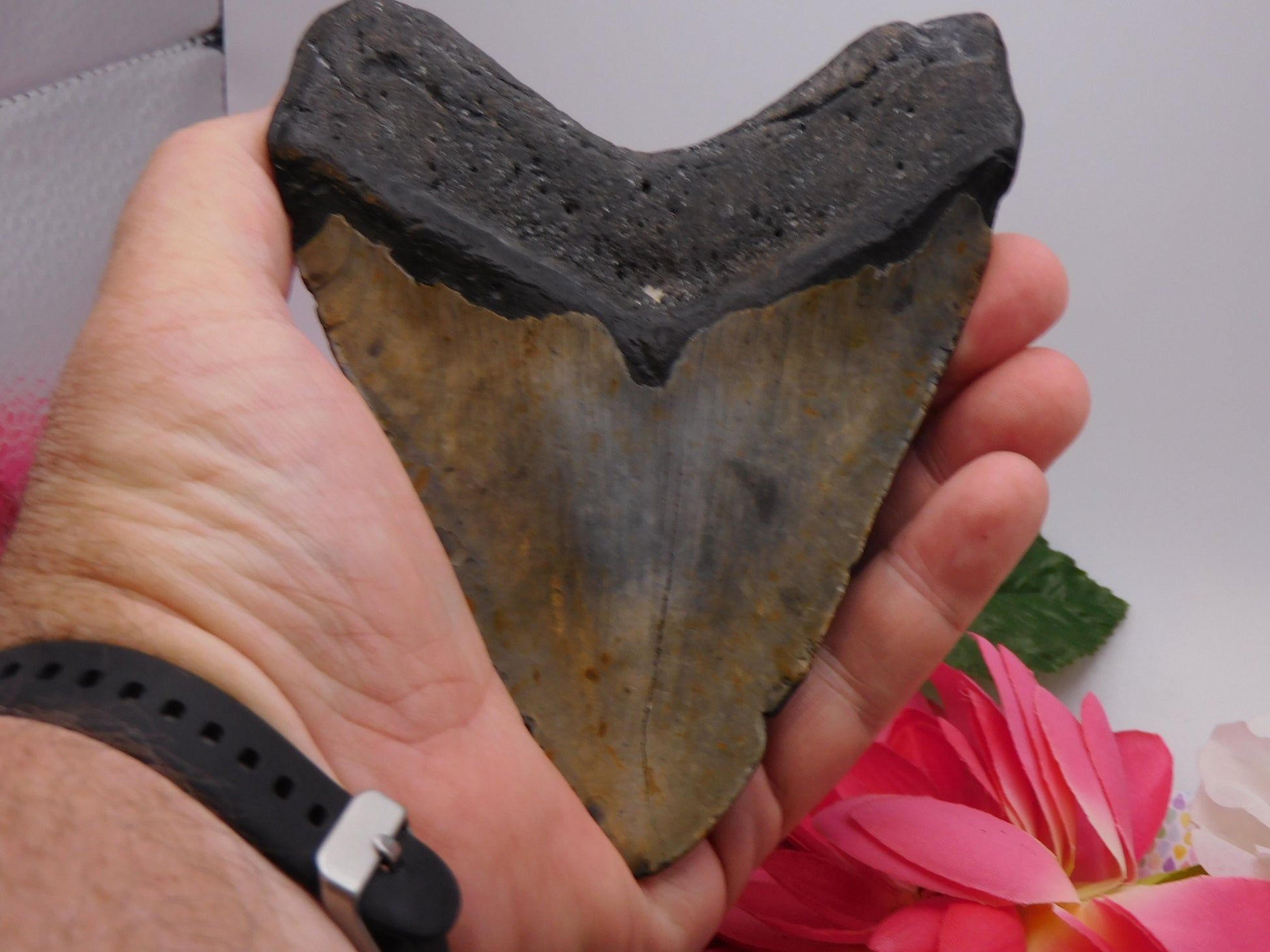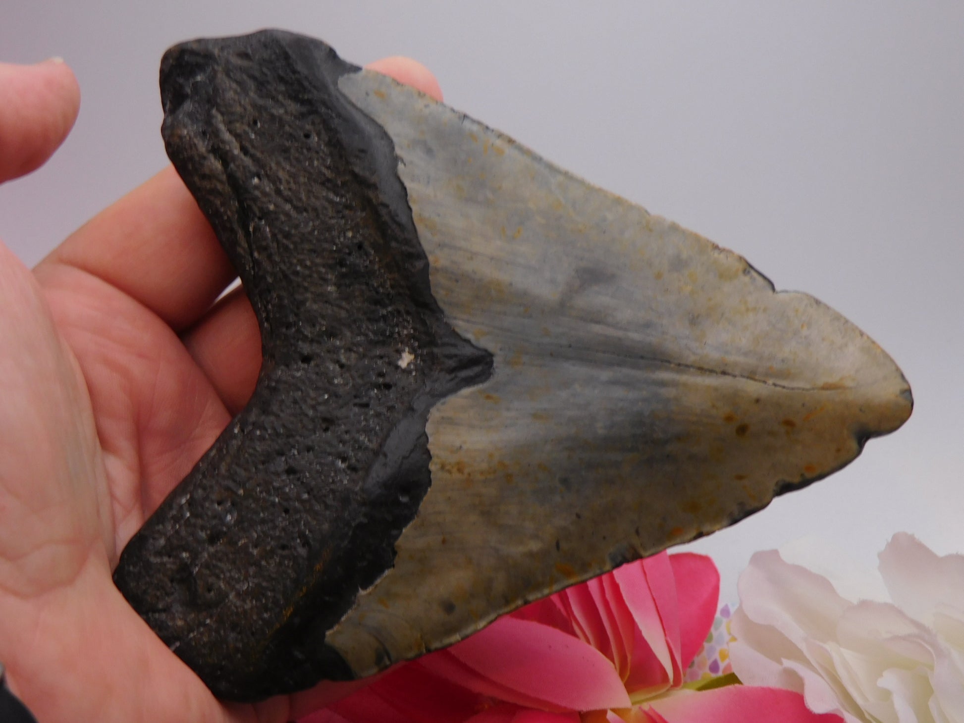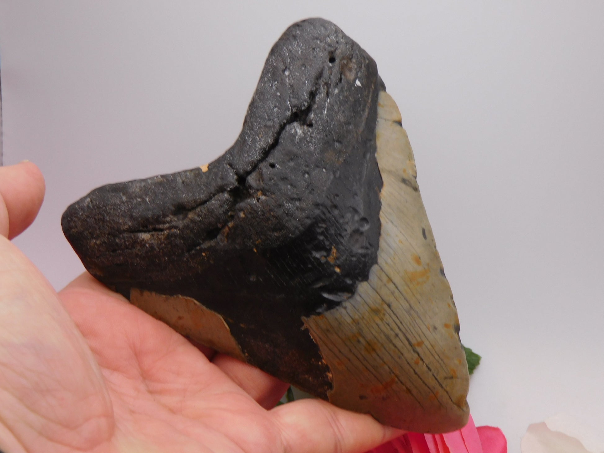 The name Megalodon means "big tooth", and it certainly is! This prehistoric shark roamed the oceans about 2.5 - 23 million years ago reaching lengths of up to 60 feet. Some scientists believe there may have been larger specimens reaching up to 80 feet long! They say each inch of tooth is equivalent to 10 feet of shark.