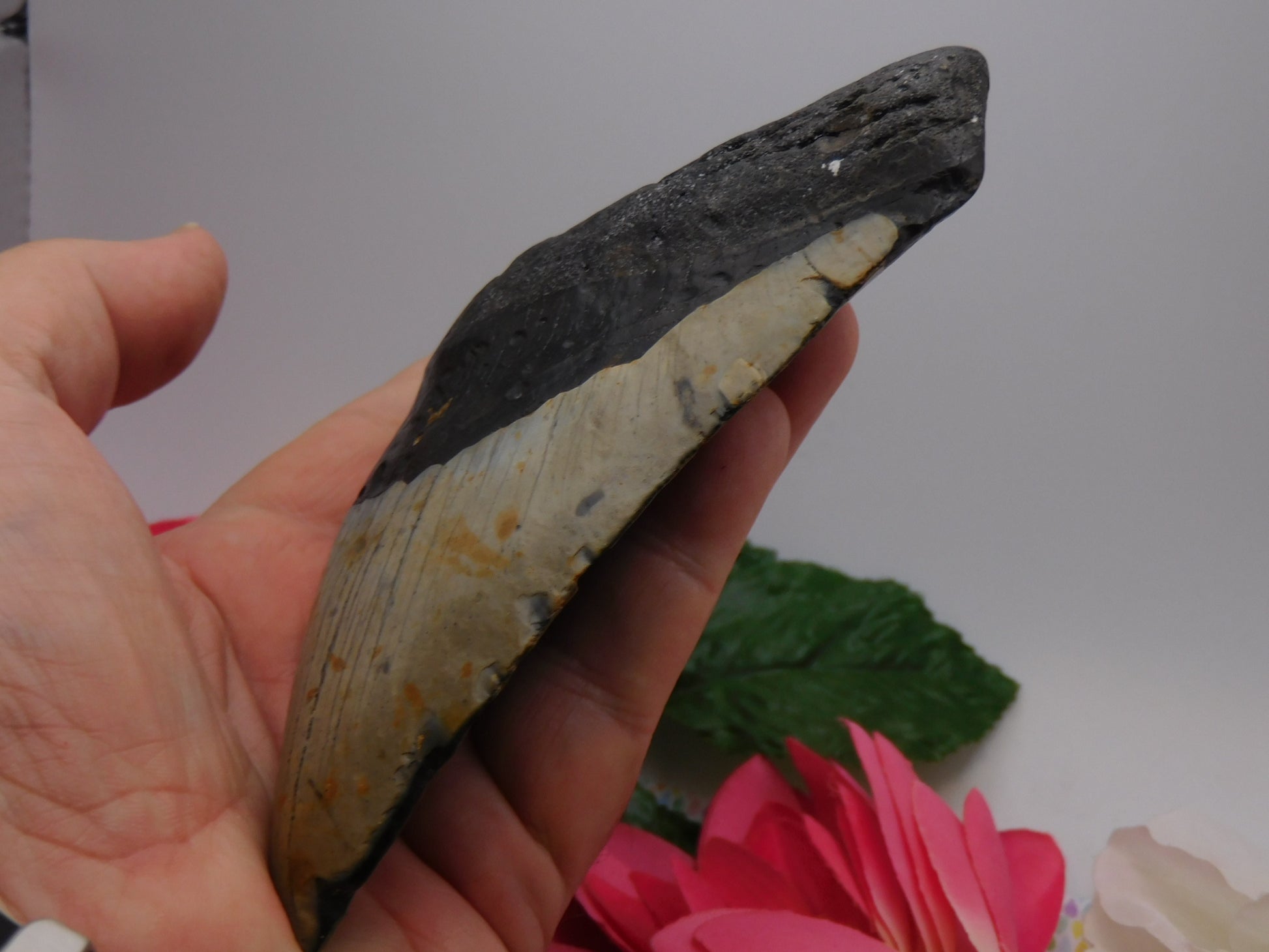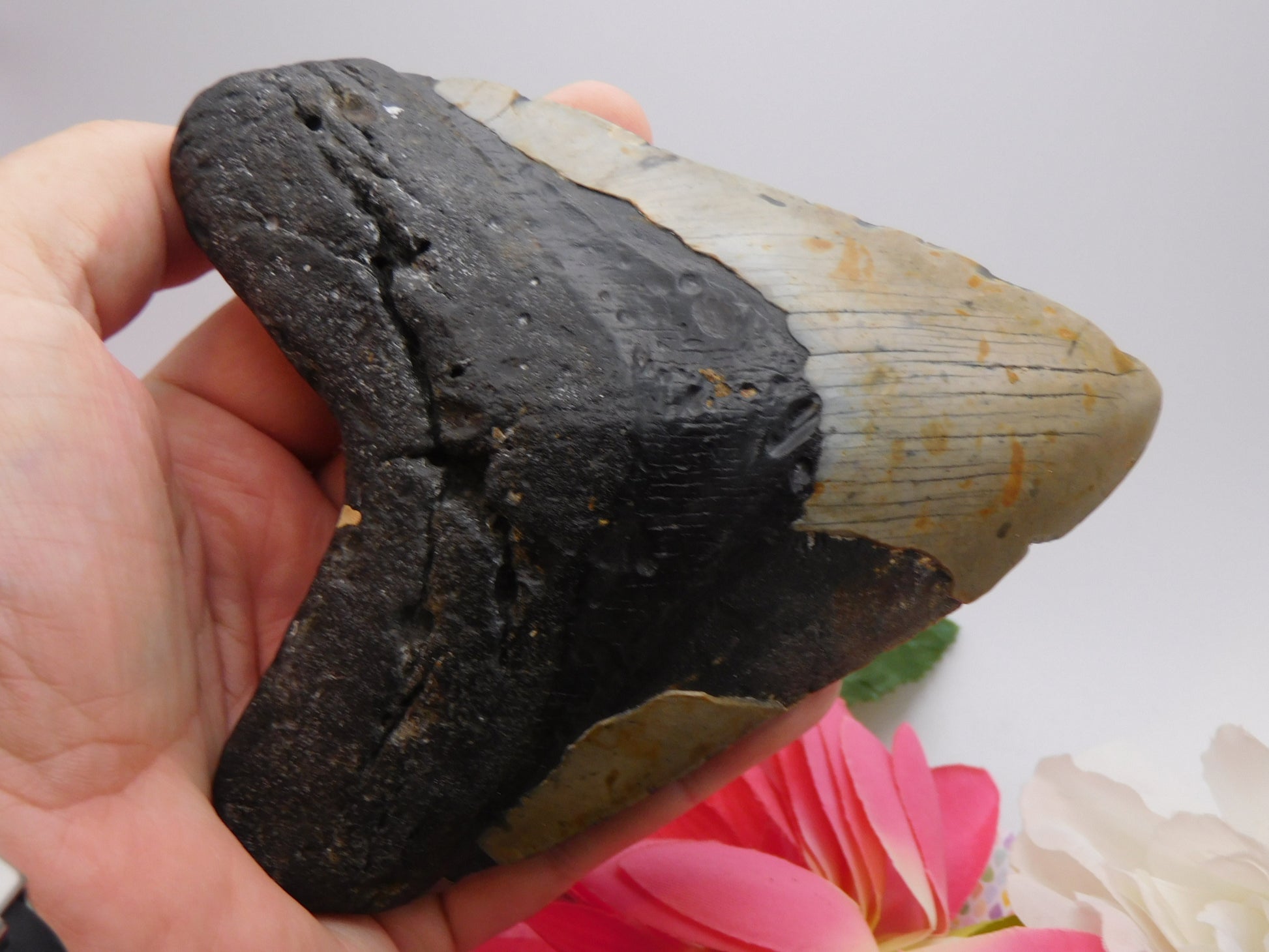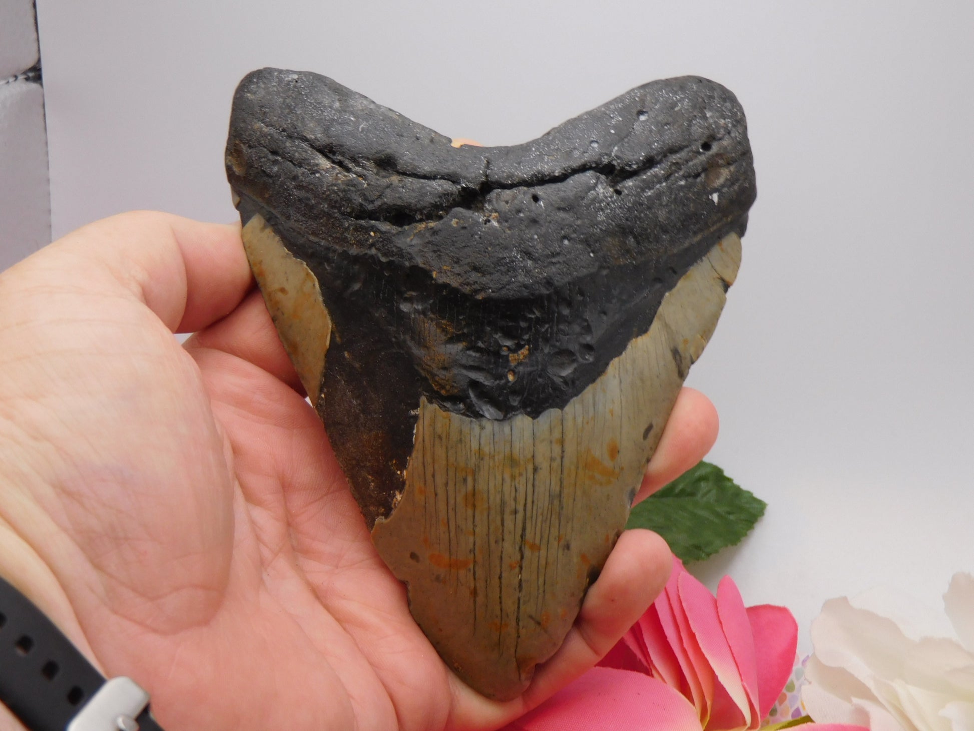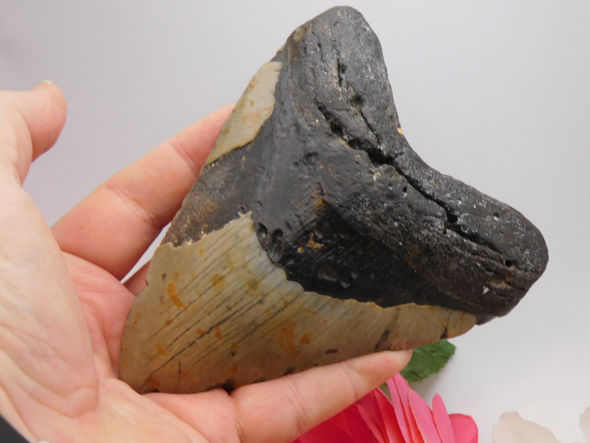 The name Megalodon means "big tooth", and it certainly is! This prehistoric shark roamed the oceans about 2.5 - 23 million years ago reaching lengths of up to 60 feet. Some scientists believe there may have been larger specimens reaching up to 80 feet long! They say each inch of tooth is equivalent to 10 feet of shark.